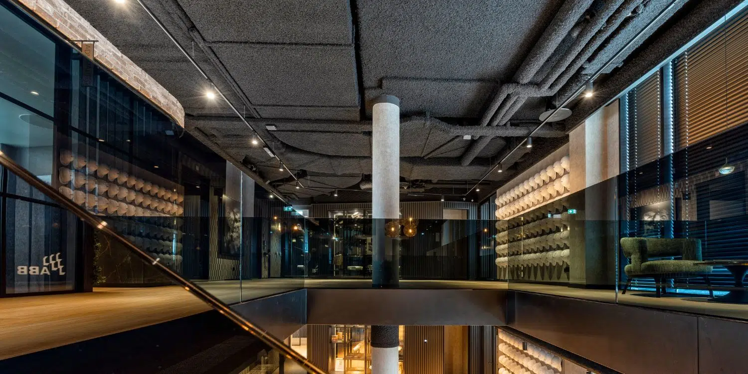 With many years of experience in the Netherlands, Acomo Acoustics has perfected the Acomo® Acoustic Spray System—a seamless, sound-absorbing finish for ceilings and walls made from 100% recycled cellulose fibers. Our solutions have been applied in offices, schools, retail spaces and large commercial projects, consistently delivering outstanding acoustic comfort, fire safety (EN 13501-1 Class B) and a modern, elegant look.
