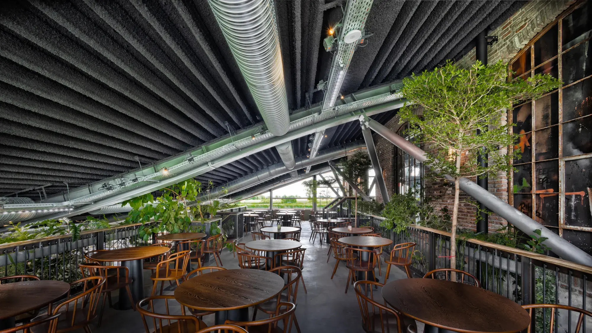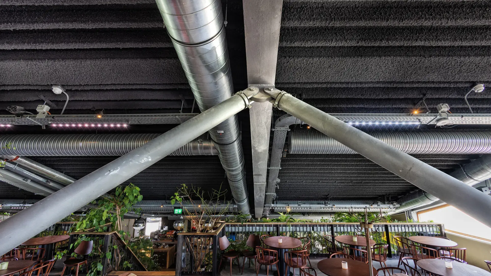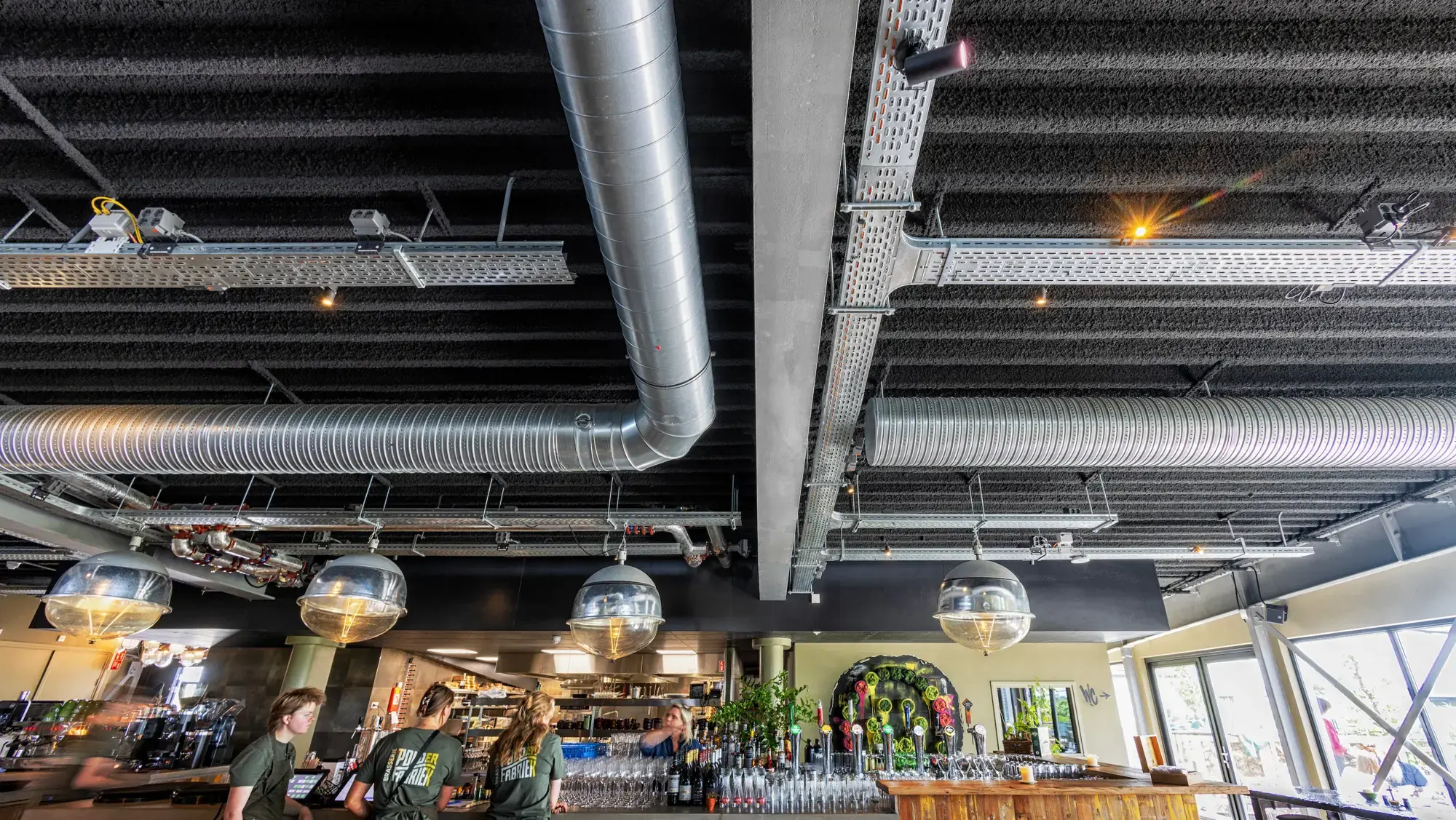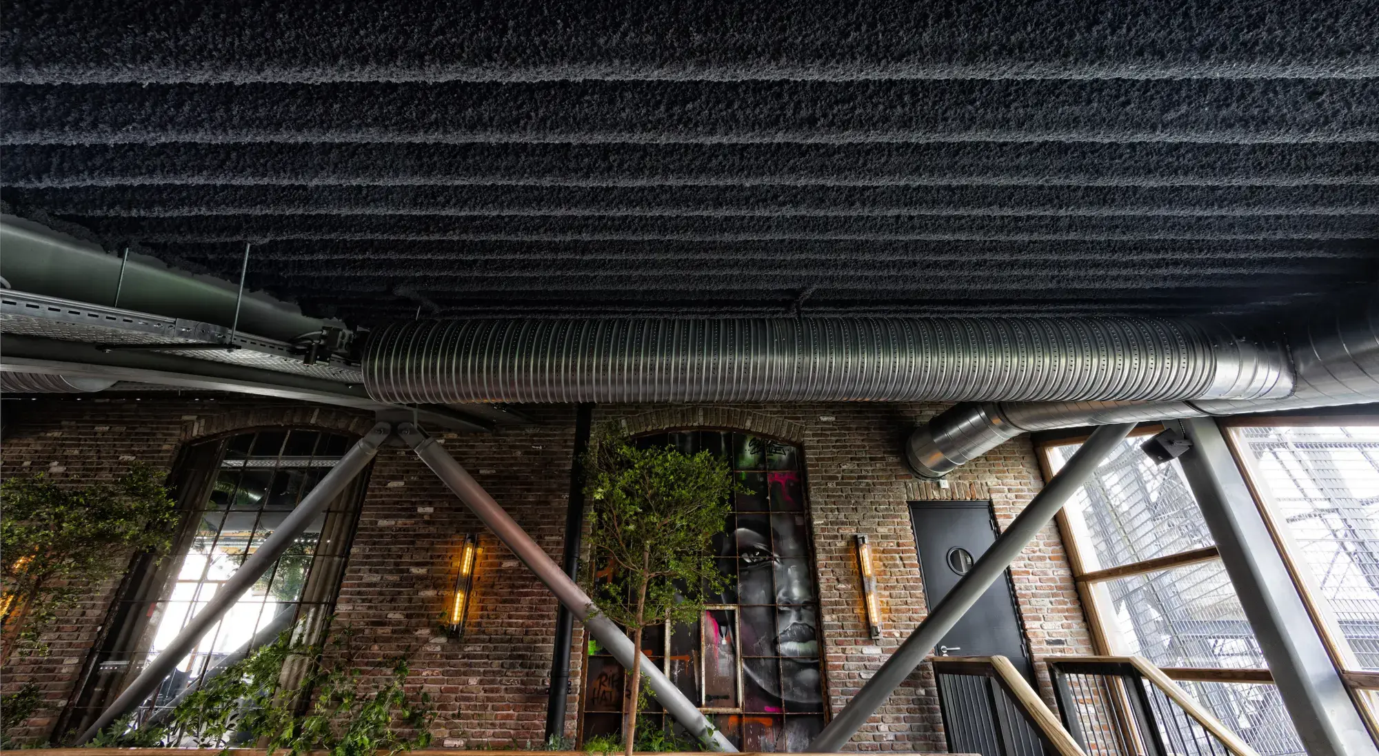 At Brasserie Polderfabriek in Leiderdorp, we applied our Acomo® Solid acoustic spray solution to effectively tackle sound issues while giving the space a stylish industrial look. In total, we sprayed 500m² in the color Anthracite with Acomo® Solid, spread across various areas of the brasserie. Thanks to this solution, Acomo® Solid enhances the calm and inspiration that Brasserie Polderfabriek offers every visitor.The result is a serene environment that serves as a true escape from the hustle and bustle of the city. Guests can now enjoy a peaceful and atmospheric ambiance, perfect for a relaxed meal or an inspiring gathering. 500m², Acomo® Solid Anthracite