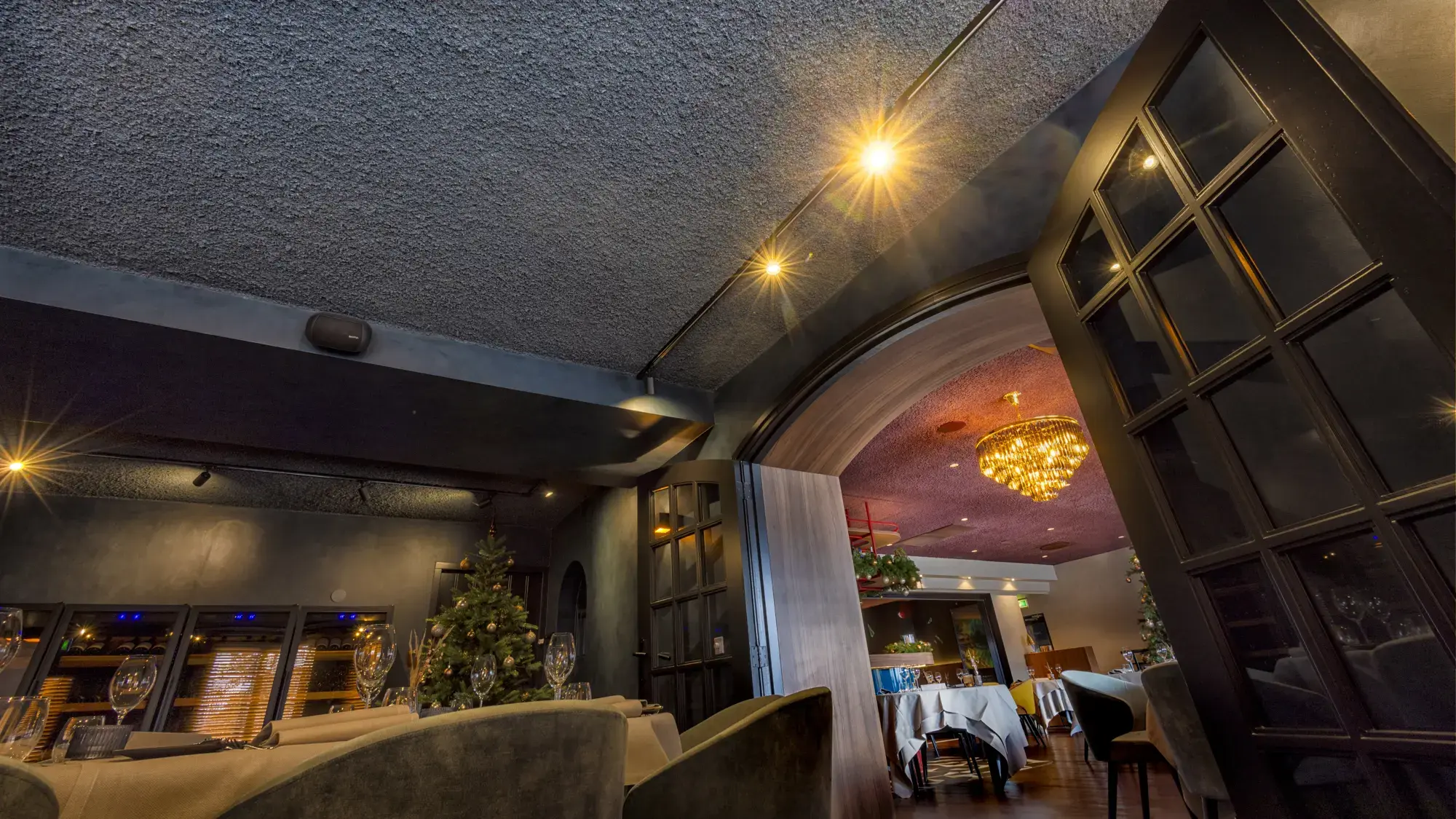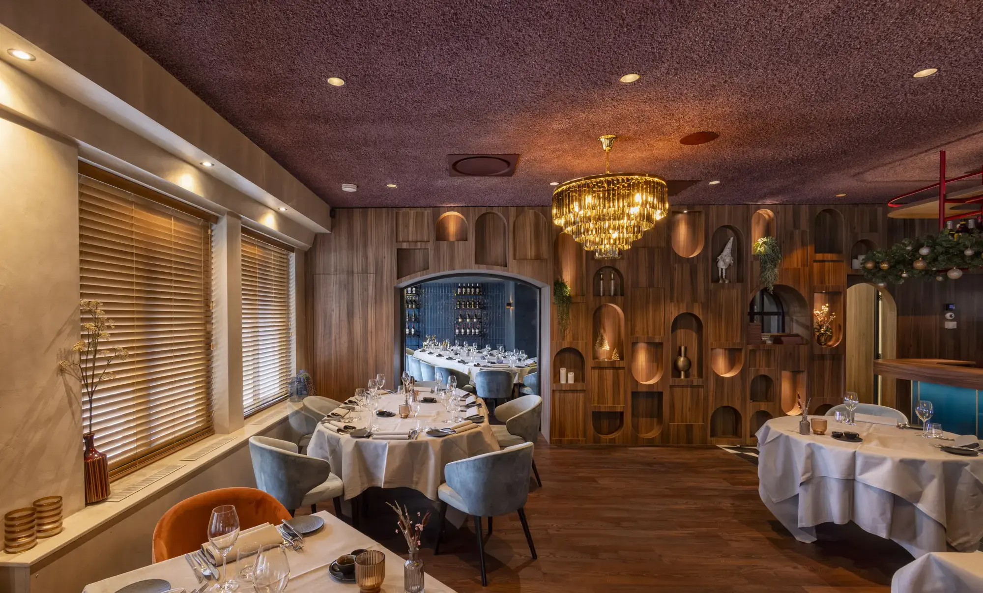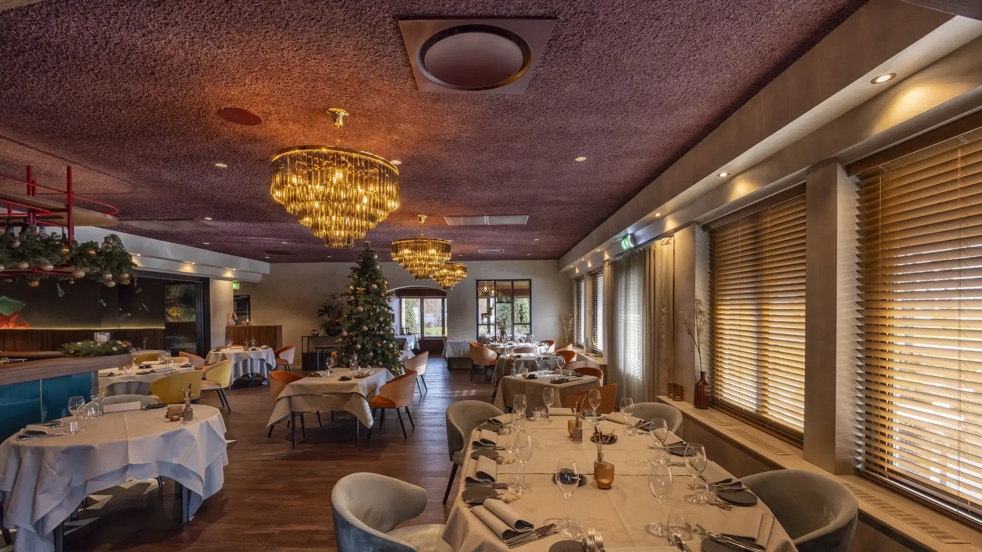 During the Christmas season, we had the wonderful opportunity to give Restaurant Duizel an acoustic makeover. Approximately 500m² is now finished with our Acomo® Style acoustic spray in Beige, Deep Blue, and Purple. This not only enhanced the restaurant visually but also significantly improved the acoustics, perfectly matching the festive atmosphere. We are delighted with the result and grateful for the opportunity to contribute to the comfort and ambiance of Restaurant Duizel.